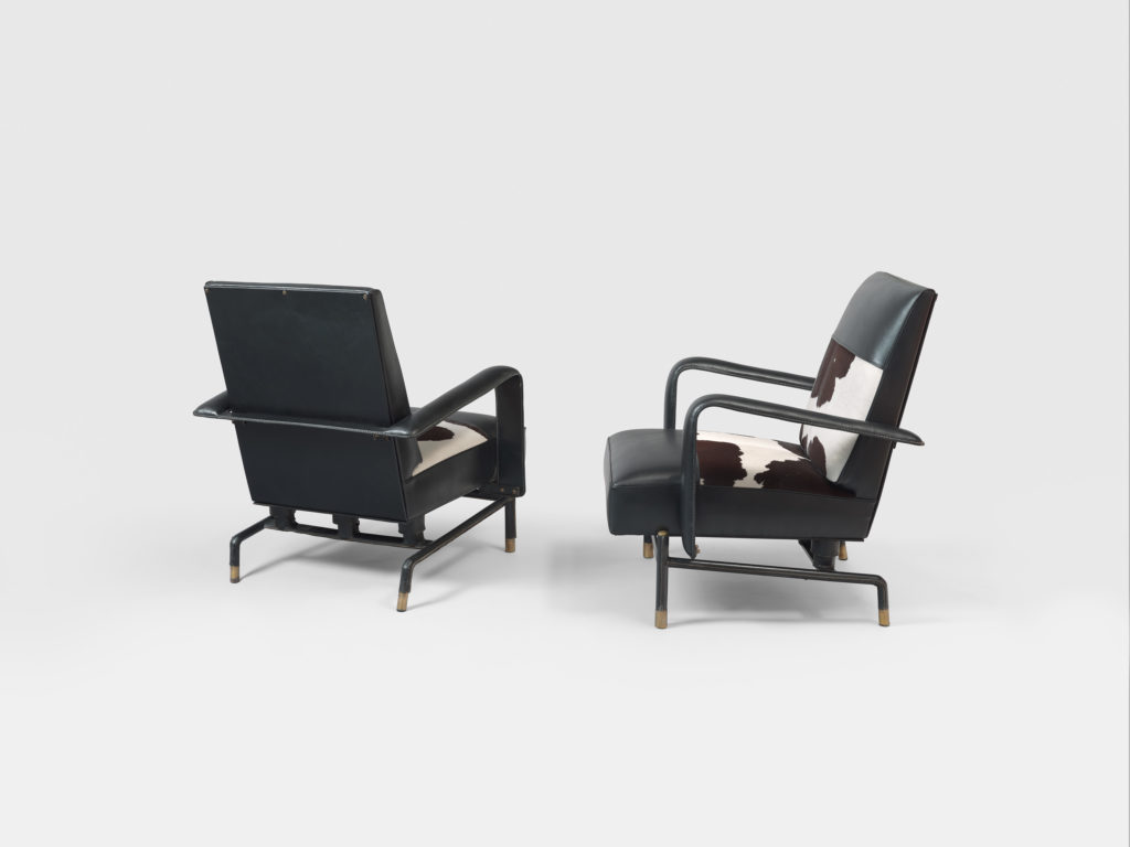 Rare pair of chairs, metal frame covered in saddle-stitched leather, seats ans back in leather and fur, 1957