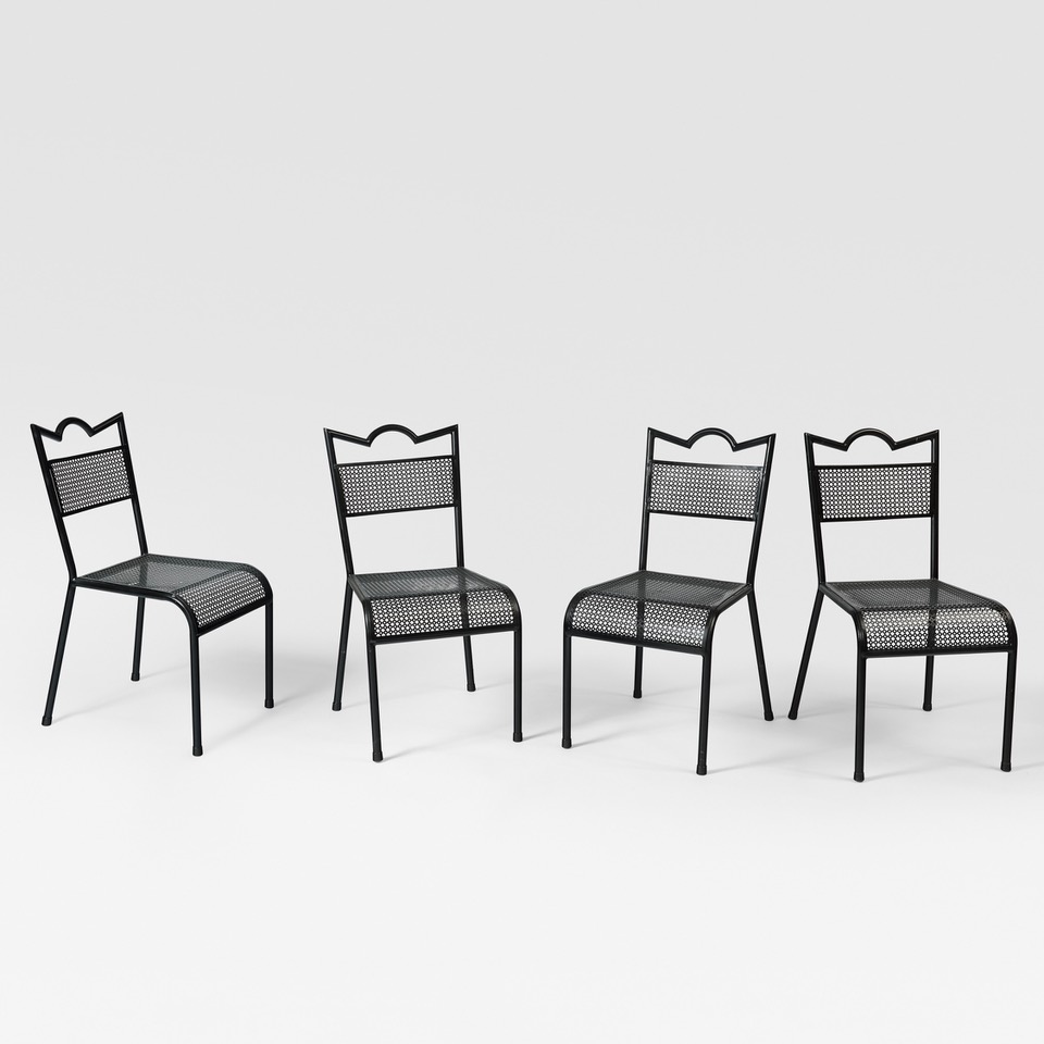 Suite de quatre chaises laquées modèle Tube, en métal tube de métal, assise et dossier tendus de tôle perforée section trèfle, vers 1950