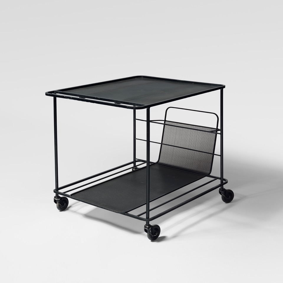 Rare et grande desserte en métal laqué noir, deux plateaux tendus de tôle perforée type Rigitulle, vers 1954