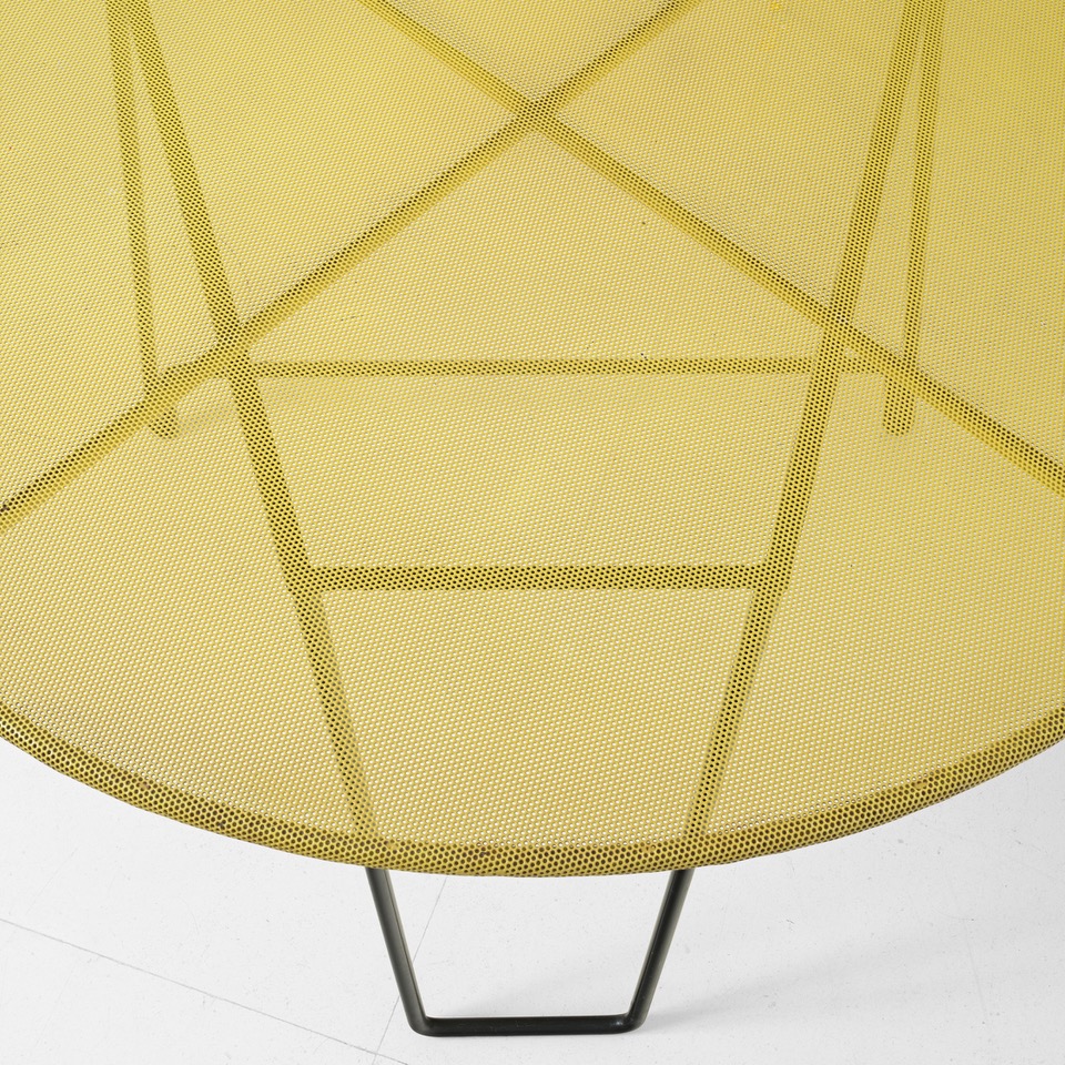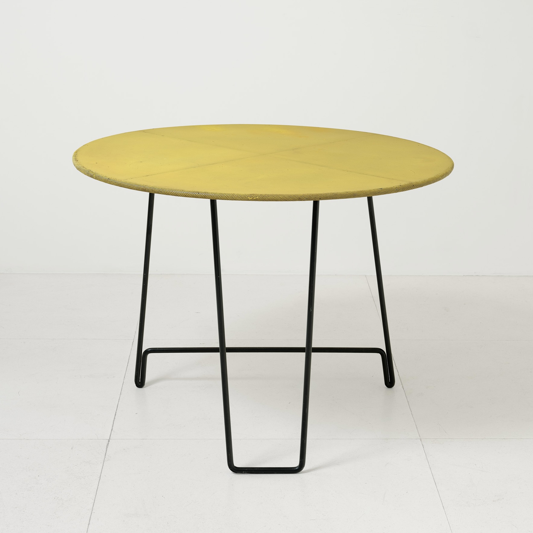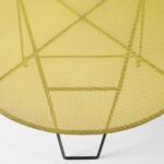 Table modèle Nagasaki, piétement en métal laqué noir, plateau circulaire tendu de tôle perforée type Rigitulle laquée jaune, 1954