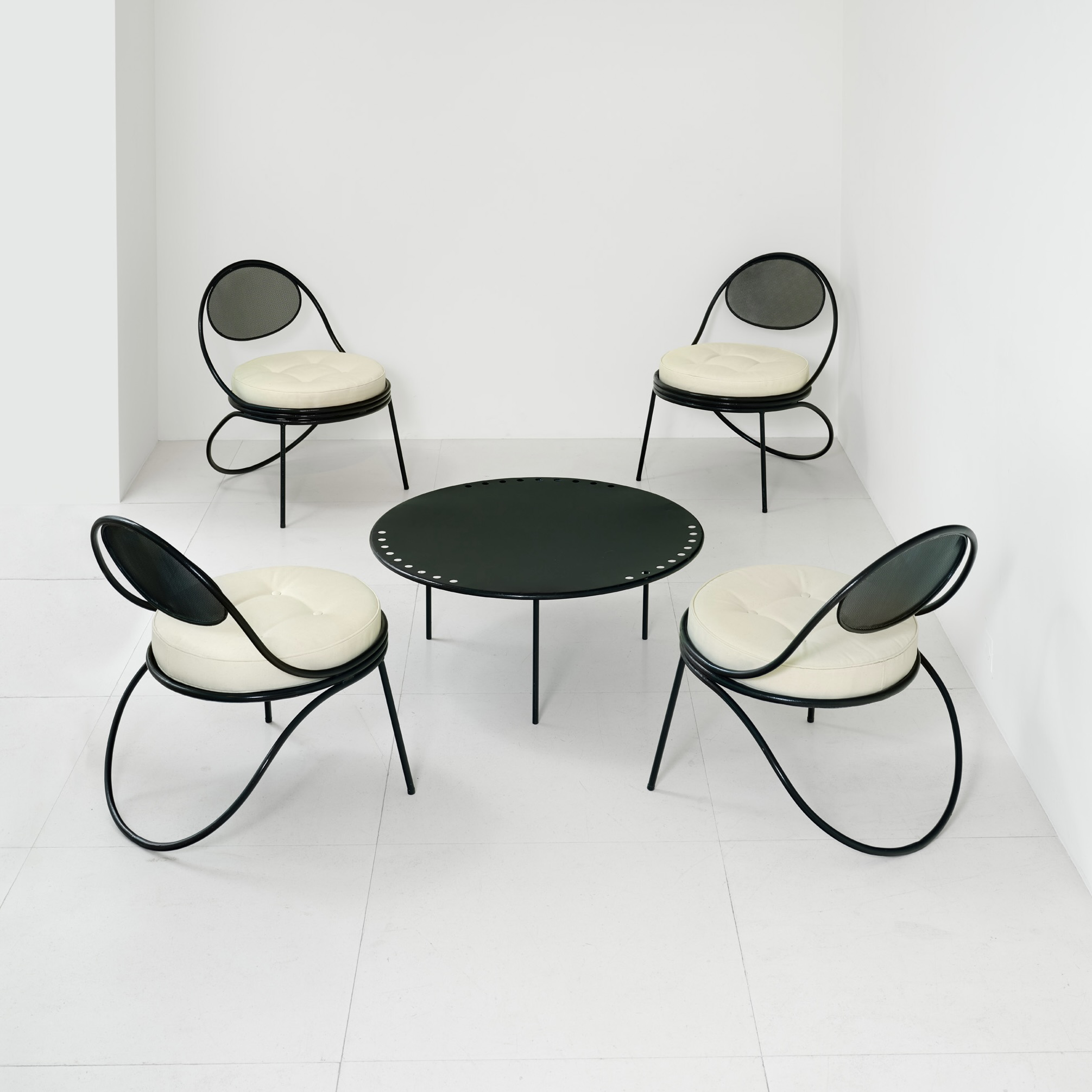 Rare ensemble modèle Copacabana laqué noir, une table basse à plateau circulaire en tôle supporté par trois pieds en retrait, quatre fauteuils à dossier tendu de tôle perforée type Rigitulle, 1955